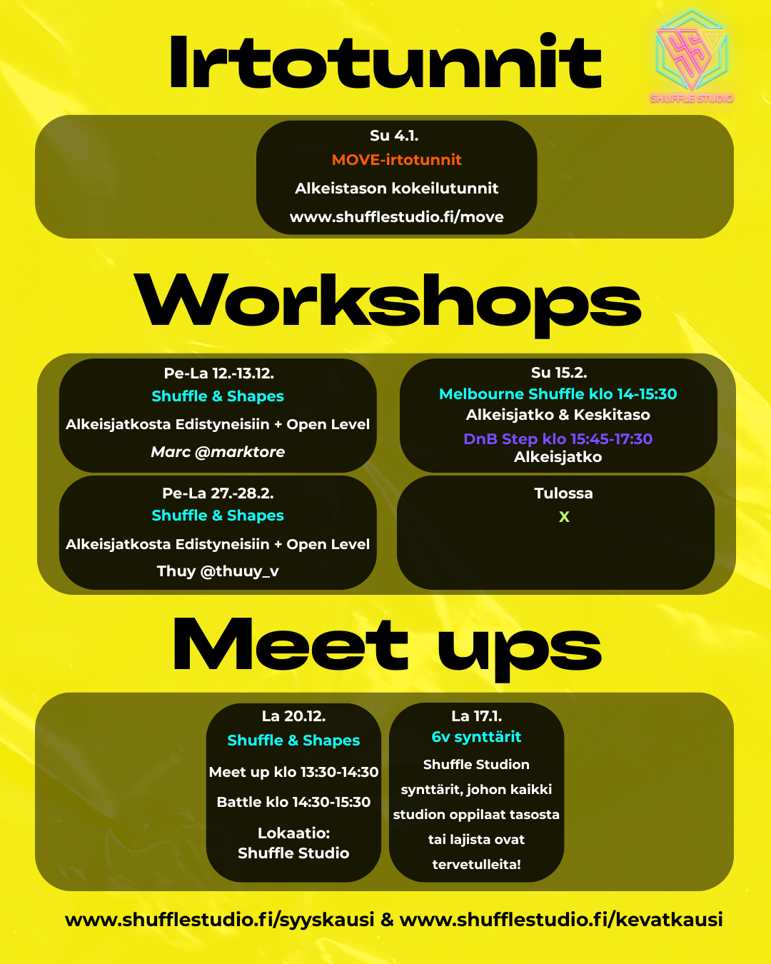 Ilmaisia Shuffle-tapaamisia, jonne kaikki ovat tervetulleita tanssimaan shufflea, sekä tutustumaan toisiinsa. Luodaan yhdessä yhteisö - Rohkeasti mukaan! Tapaamme aina studiolla (Studio 1), ellei erikseen mainita.
